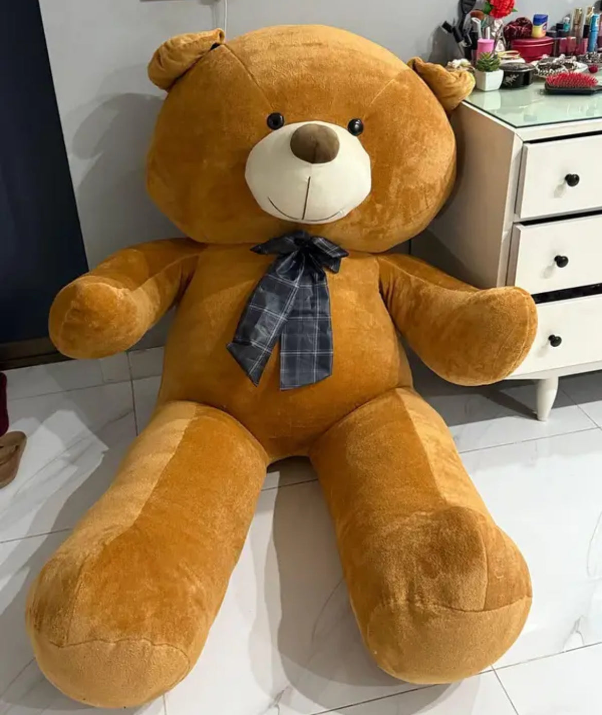 Bring endless smiles and warm hugs home with our giant plush teddy bear! Made with ultra-soft, high-quality fabric and filled with fluffy cotton, this teddy is perfect for cuddling, gifting, or decorating your room. Its adorable face, huggable arms, and super-sized design make it the ultimate companion for kids, loved ones, and even for yourself.